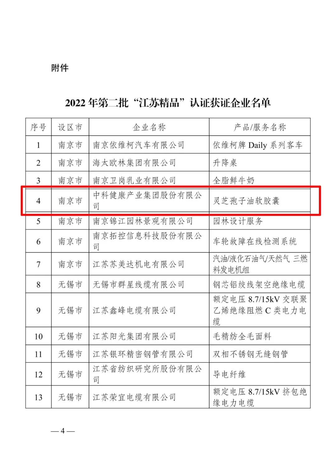 近日,江苏省质量发展委员会办公室联合省市场监管局等八部门发布2022年第二批“江苏精品”认证获证企业名单,南京市共有7家企业通过认证,中科健康产业集团(以下简称中科集团)主打产品“中科灵芝孢子油软胶囊”喜获“江苏精品”认证。