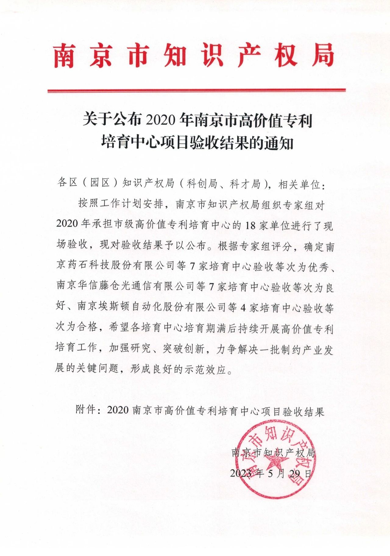 近日,据南京市知识产权局发文:南京市知识产权局组织专家组对2020年承担市级高价值专利培育中心的18家单位进行了现场验收,现对验收结果予以公布。根据专家组评分,确定中科健康产业集团等7家项目培育中心验收等次为优秀,希望各培育中心培育期满后持续开展高价值专利培育工作,加强研究、突破创新,力争解决一批制约产业发展的关键问题,形成良好的示范效应。