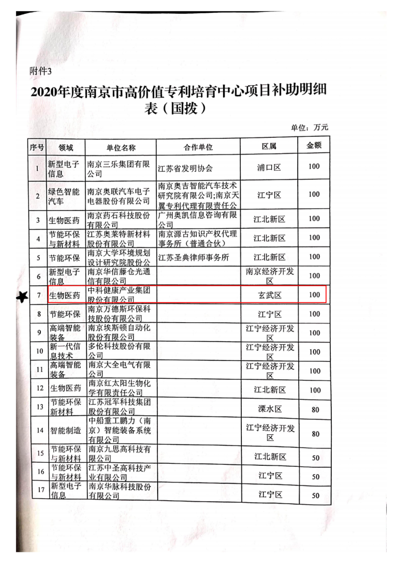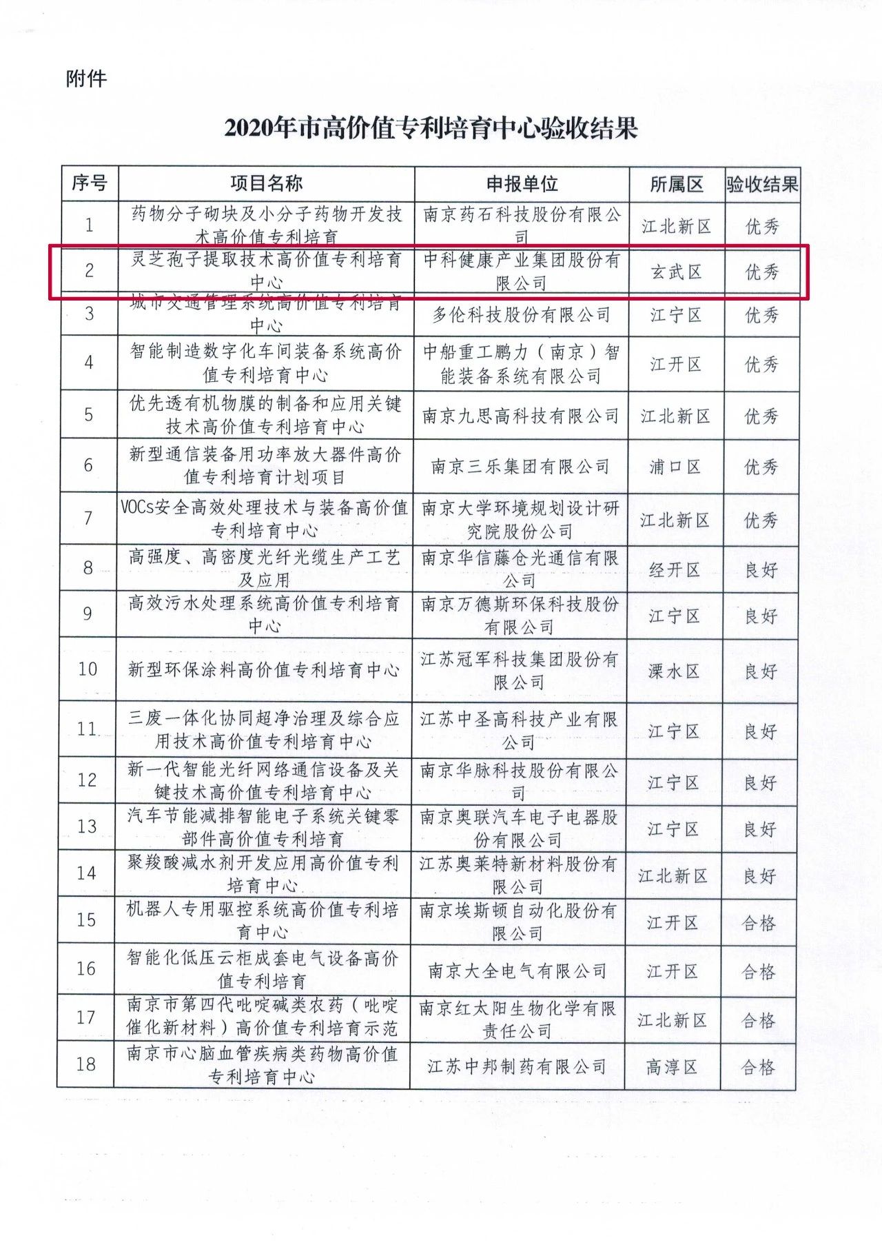 2020年,中科健康产业集团自主知识产权核心技术—“灵芝孢子提取技术”成功入选南京市高价值专利培育中心项目,并获国家专项支持资金100万元。