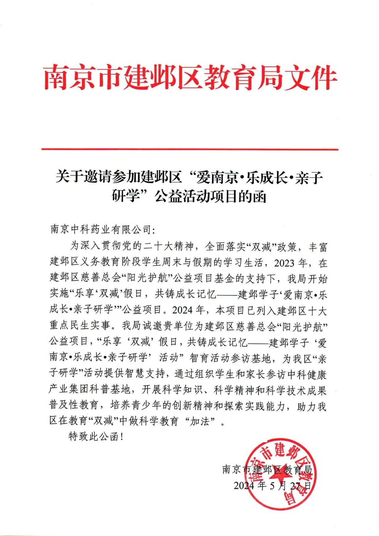 5月31日,由建邺区教育局组织的“乐享‘双减’假日,共铸成长记忆--建邺学子'爱南京·乐成长·亲子研学”公益项目150余名师生走进中科路8号—江苏省科普教育基地。通过组织学生和家长参访中科健康产业集团科普基地,开展科学知识、科学精神和科学技术成果普及性教育,旨在培养青少年的创新精神和探索实践能力,助力教育“双减”深度落地。